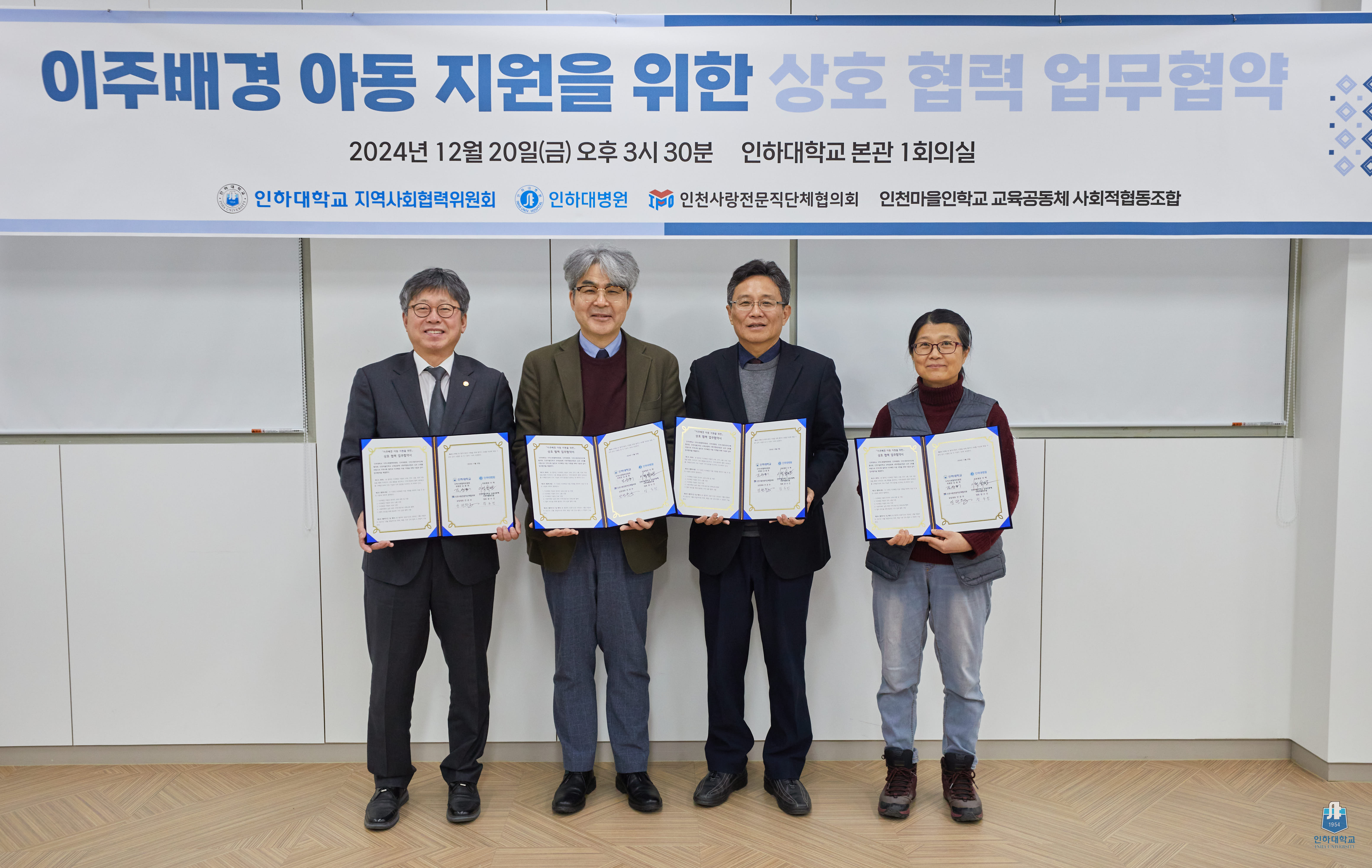 ▲ 김웅희 지역사회위원회 위원장, 최선근 인하대병원 진료부원장, 안관주 인천사랑전문직단체협의회 상임대표, 장수진 인천마을인학교 교육공동체 사회적협동조합 대표가 업무협약 체결 카지노사이트 후기사진을 촬영하고 있다.
