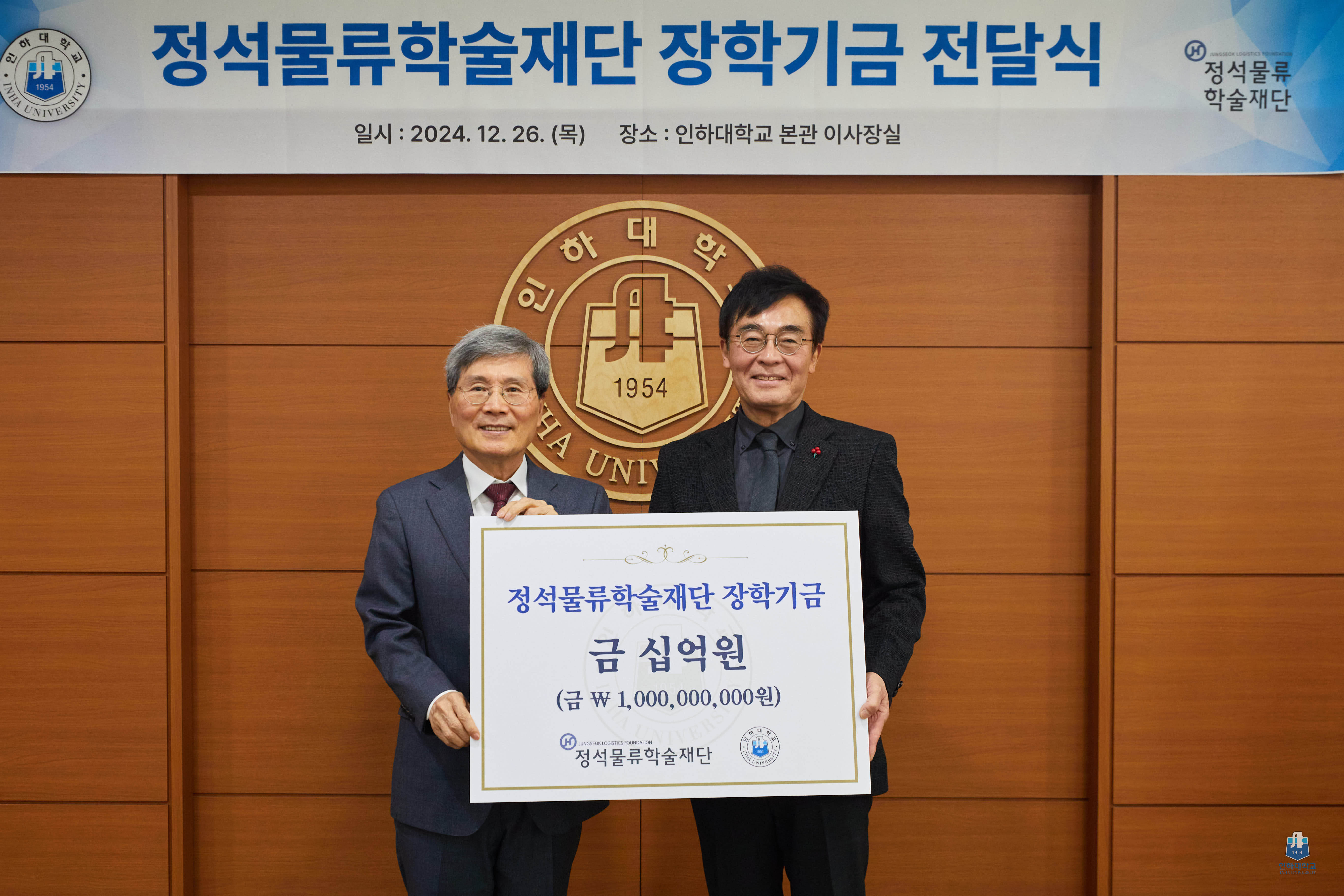 ▲ (사진 왼쪽부터) 김재훈 정석물류학술재단 이사장과 조명우 총장이 장학기금 전달식 카지노사이트 후기사진을 촬영하고 있다.