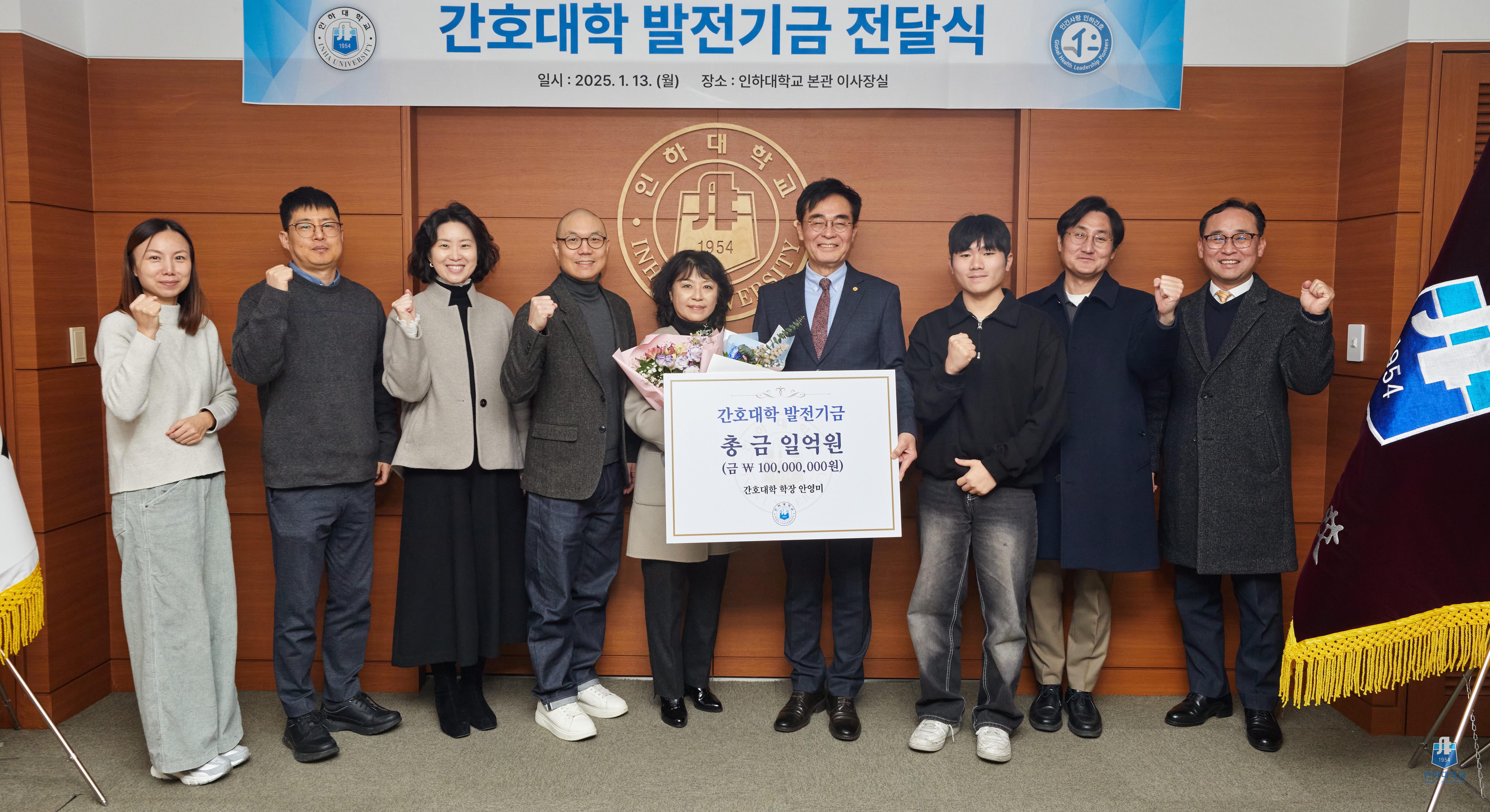 ▲ 조명우 총장, 안영미 간호대학 학장 등 간호대학 발전기금 전달식에 참여한 인사들이 카지노사이트 후기사진을 촬영하고 있다.