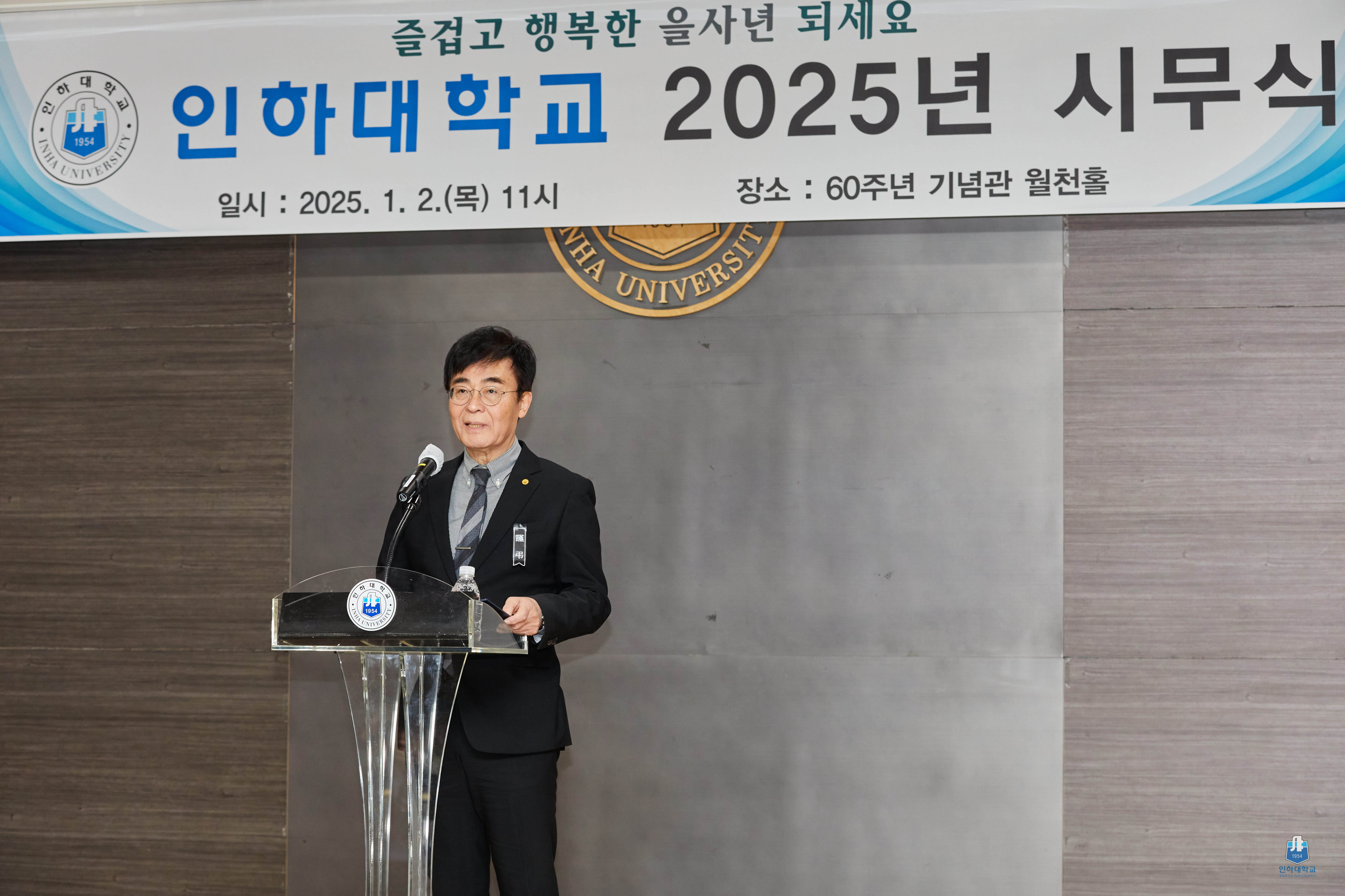 ▲ 2일 60주년카지노사이트 후기관 월천홀에서 열린 신년하례식에서 조명우 인하대 총장이 2025년 신년사를 하고 있다.