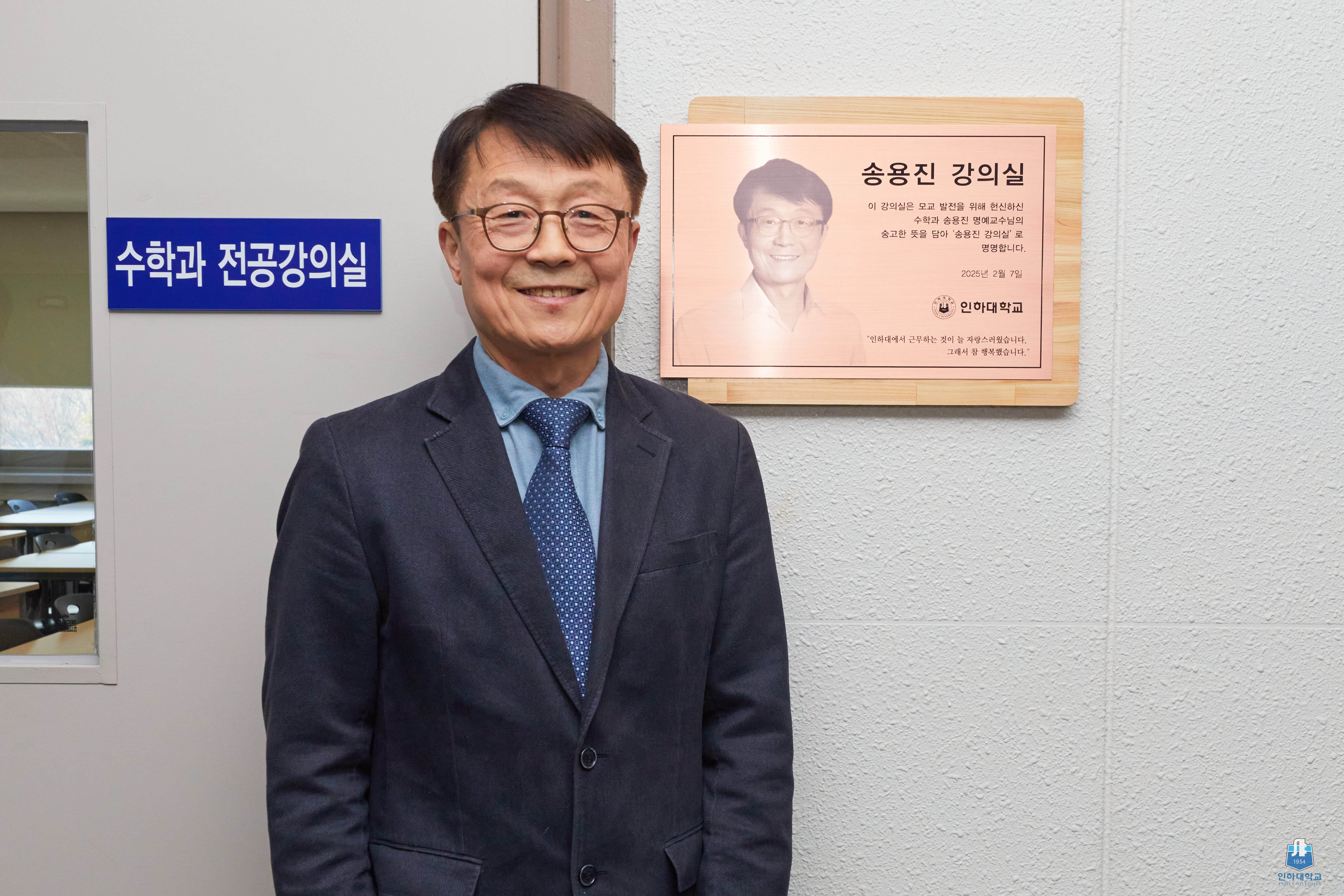 ▲ 송용진 수학과 명예교수가 ‘송용진 강의실’ 앞에서 기념사진을 촬영하고 있다.