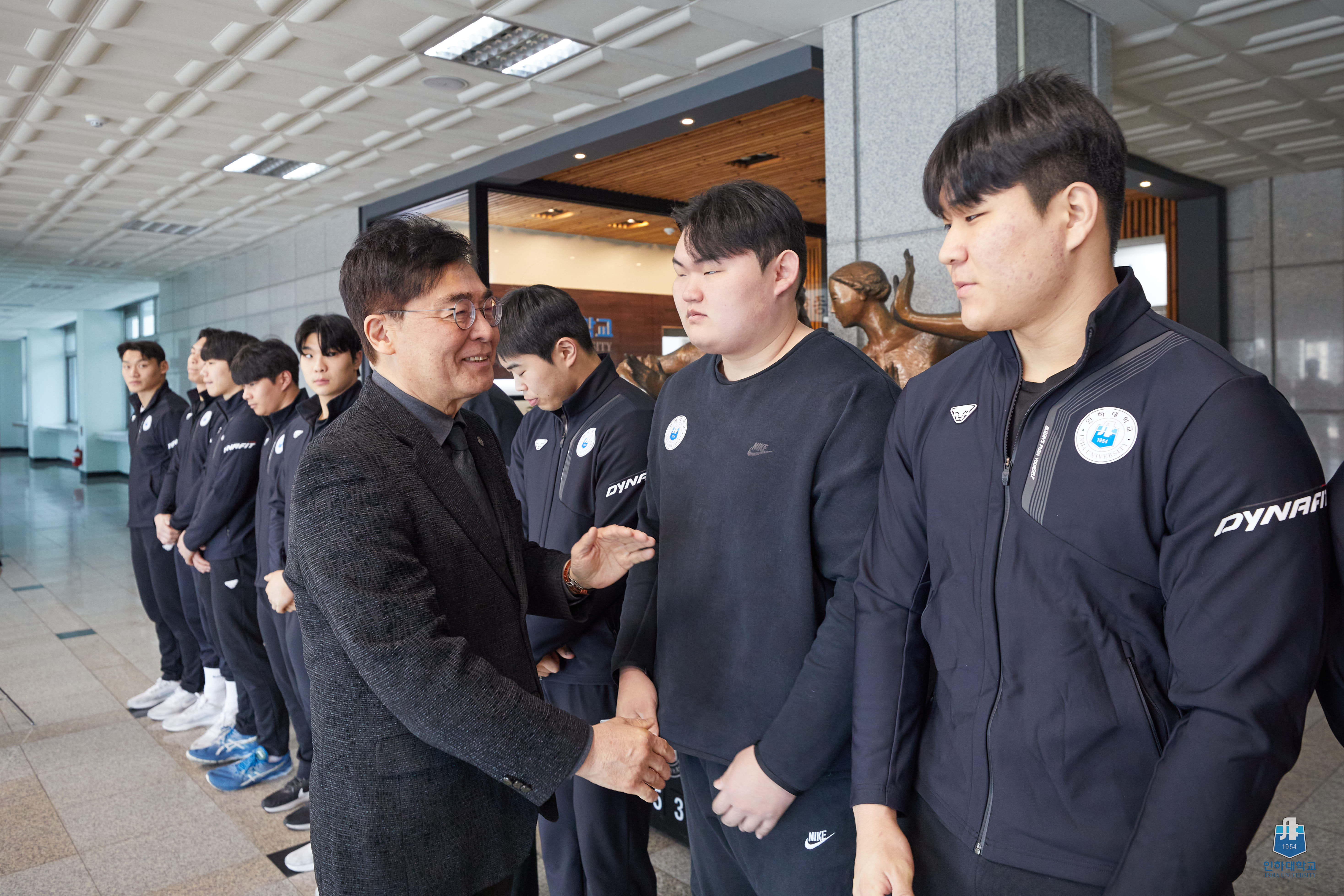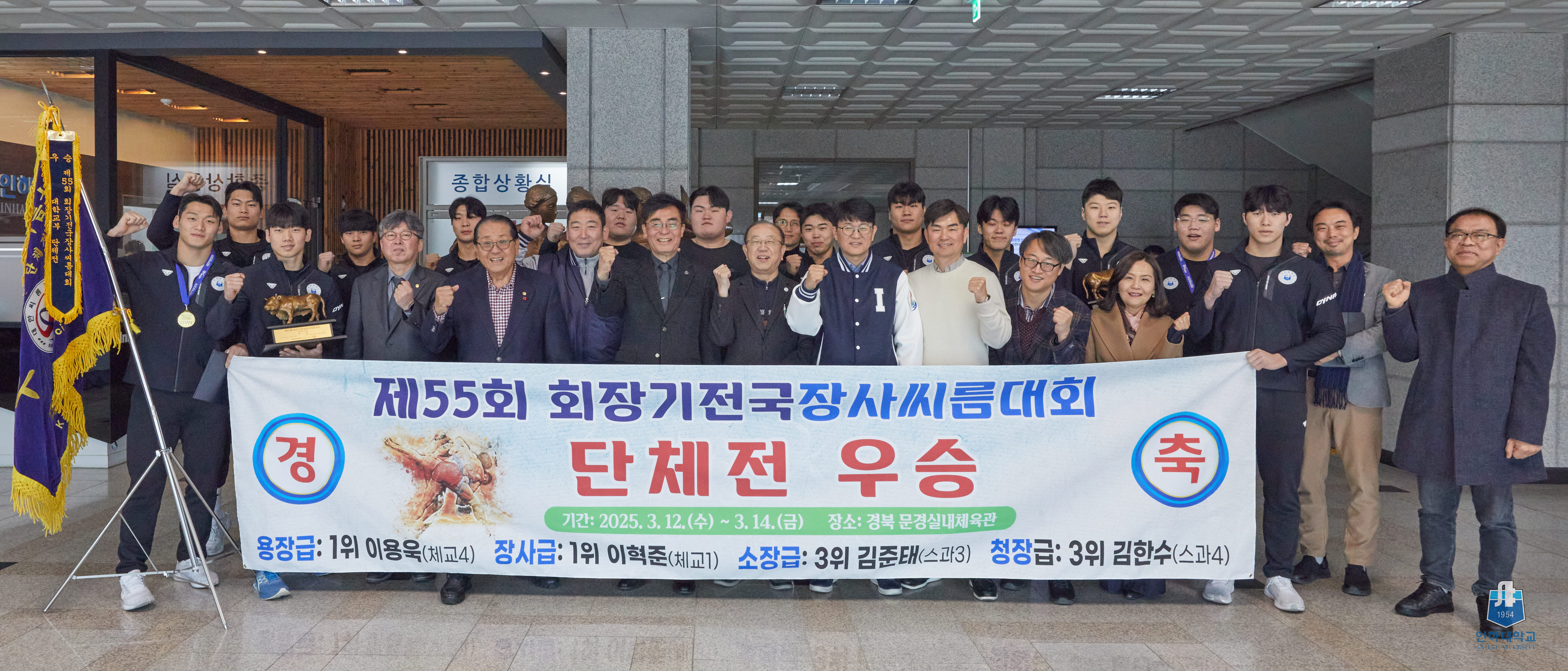 ▲ 씨름부 학생들이 대회 단체전 우승 신고식을 하고 있다.