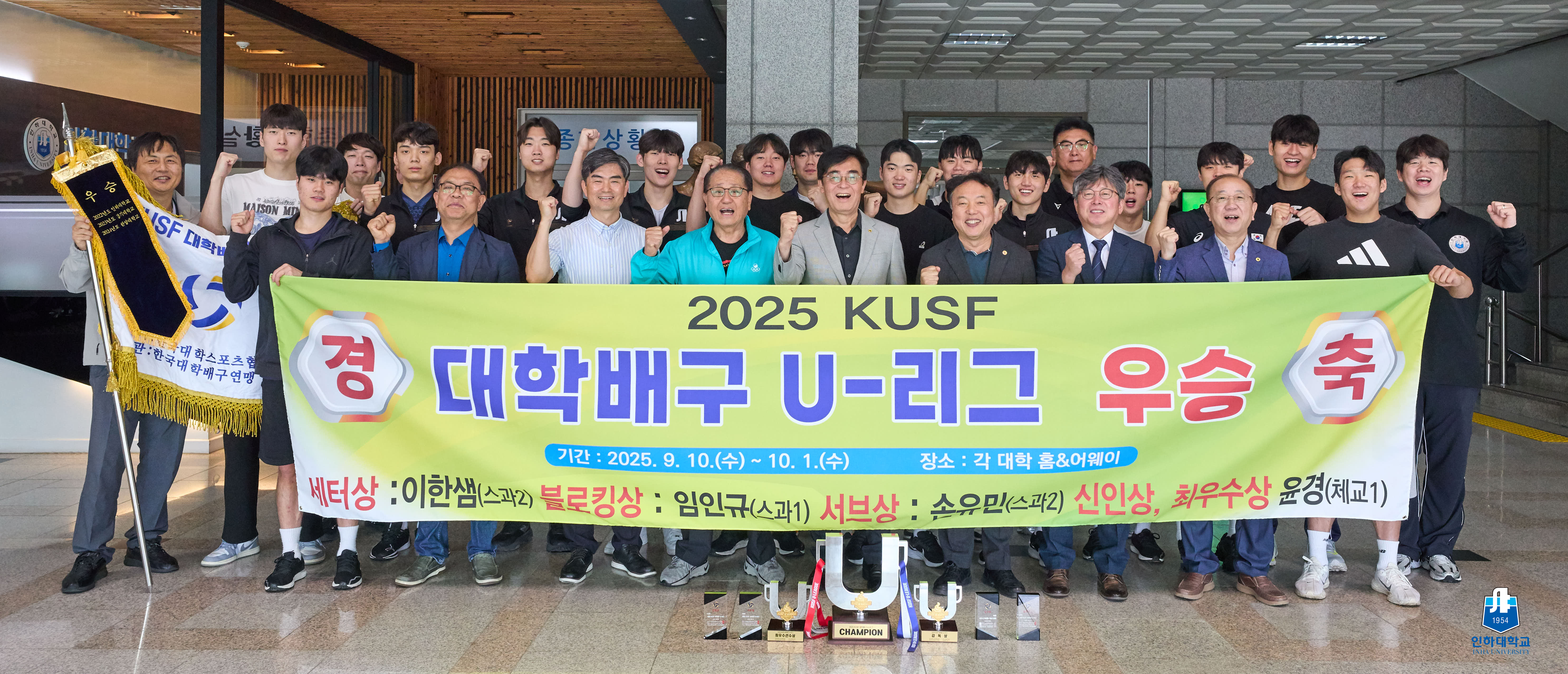 ▲ 2일 대학배구 U-리그 우승 신고식에서 배구부와 참석 내외빈이 기념사진을 촬영하고 카지노사이트 먹튀검증.