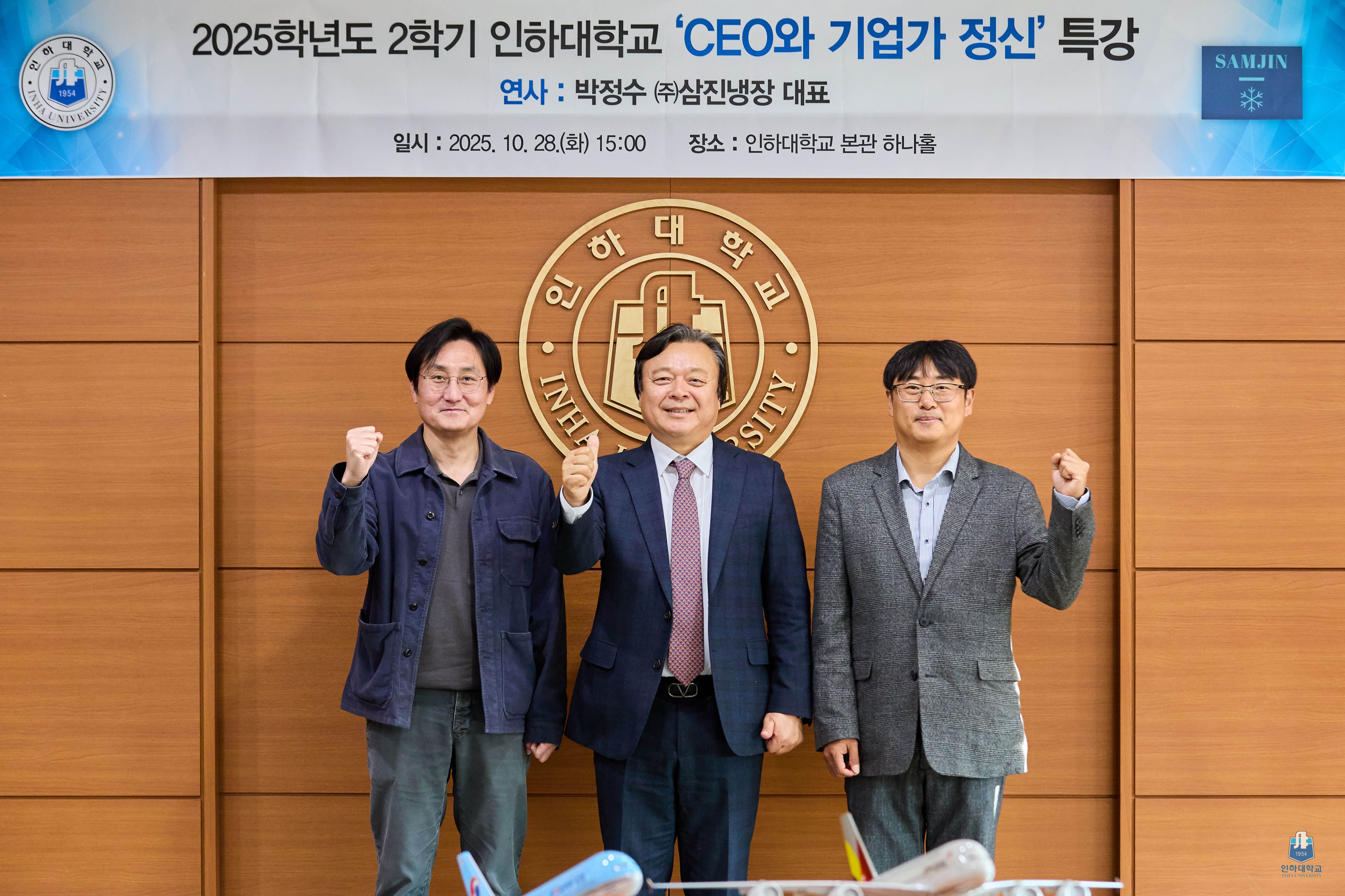 ▲지난 28일 박정수 삼진냉장 대표가 CEO 특강에 앞서 백성현 교학부총장 등과 기념사진을 촬영하고 있다.