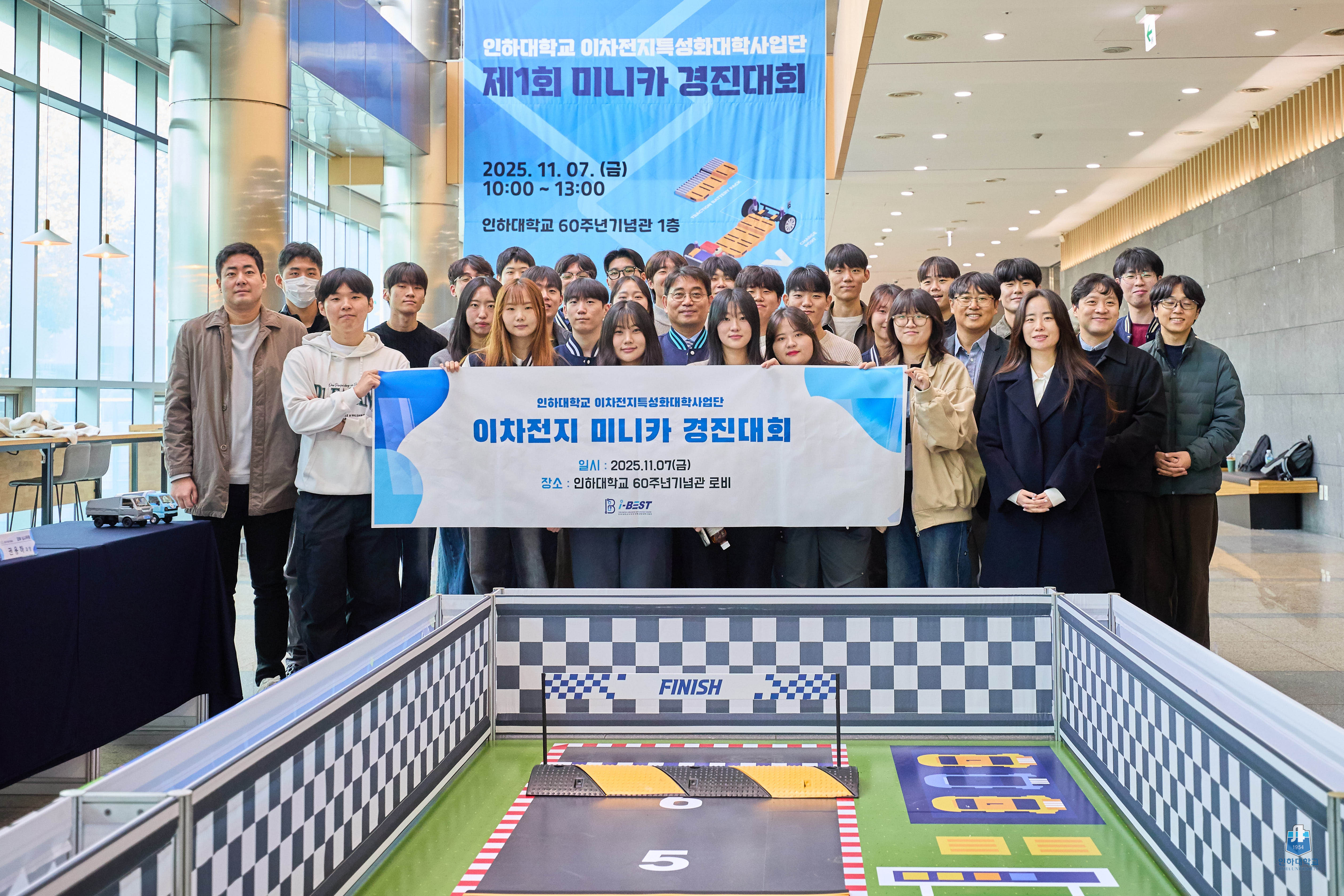 ▲이차전지특성화대학사업단이 미니카 경진대회 기념사진을 촬영하고 있다.