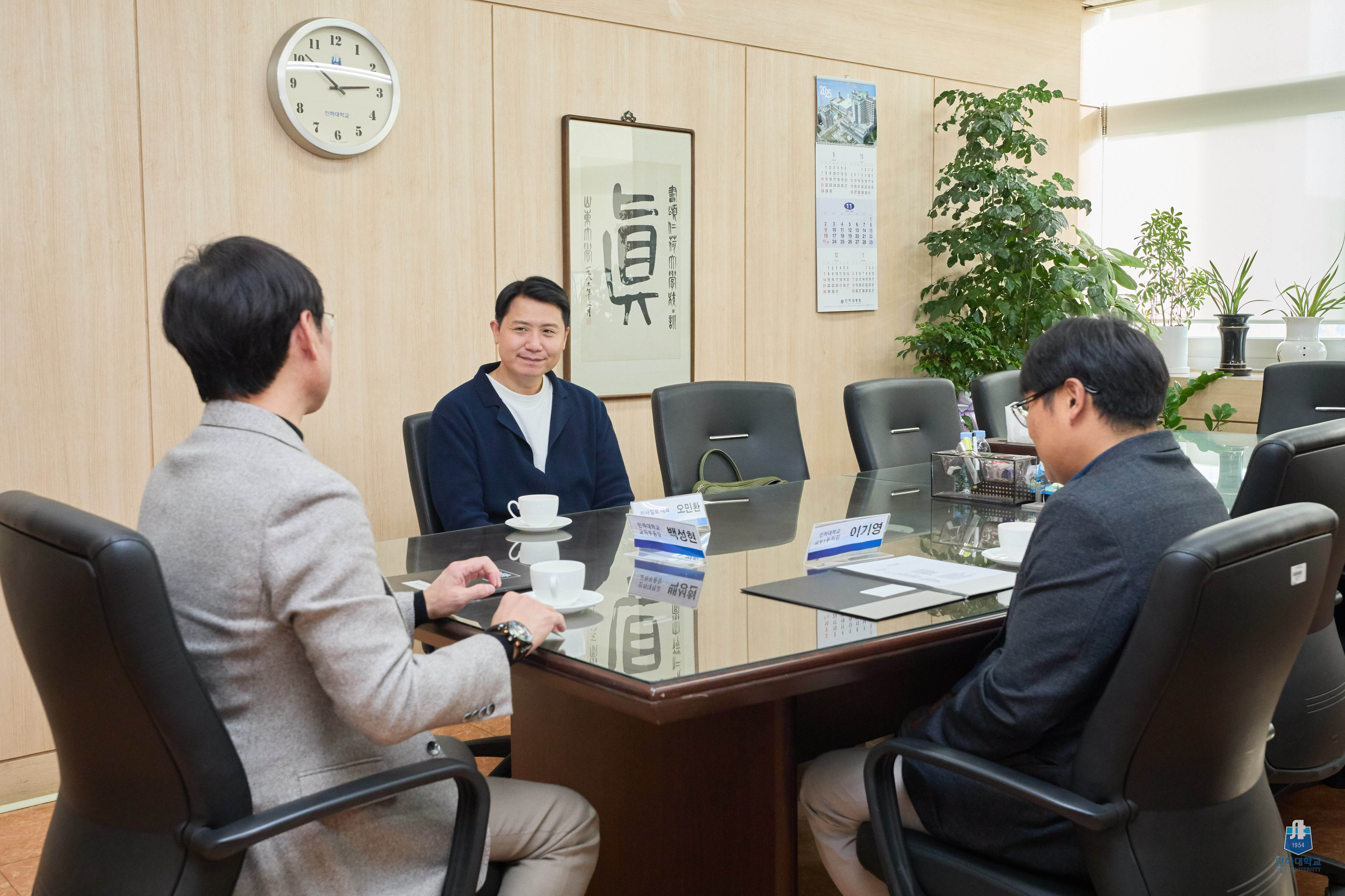 ▲11일 오민환 (주)사일로 대표가 CEO 특강에 앞서 백성현 교학부총장 등과 이야기를 나누고 있다.