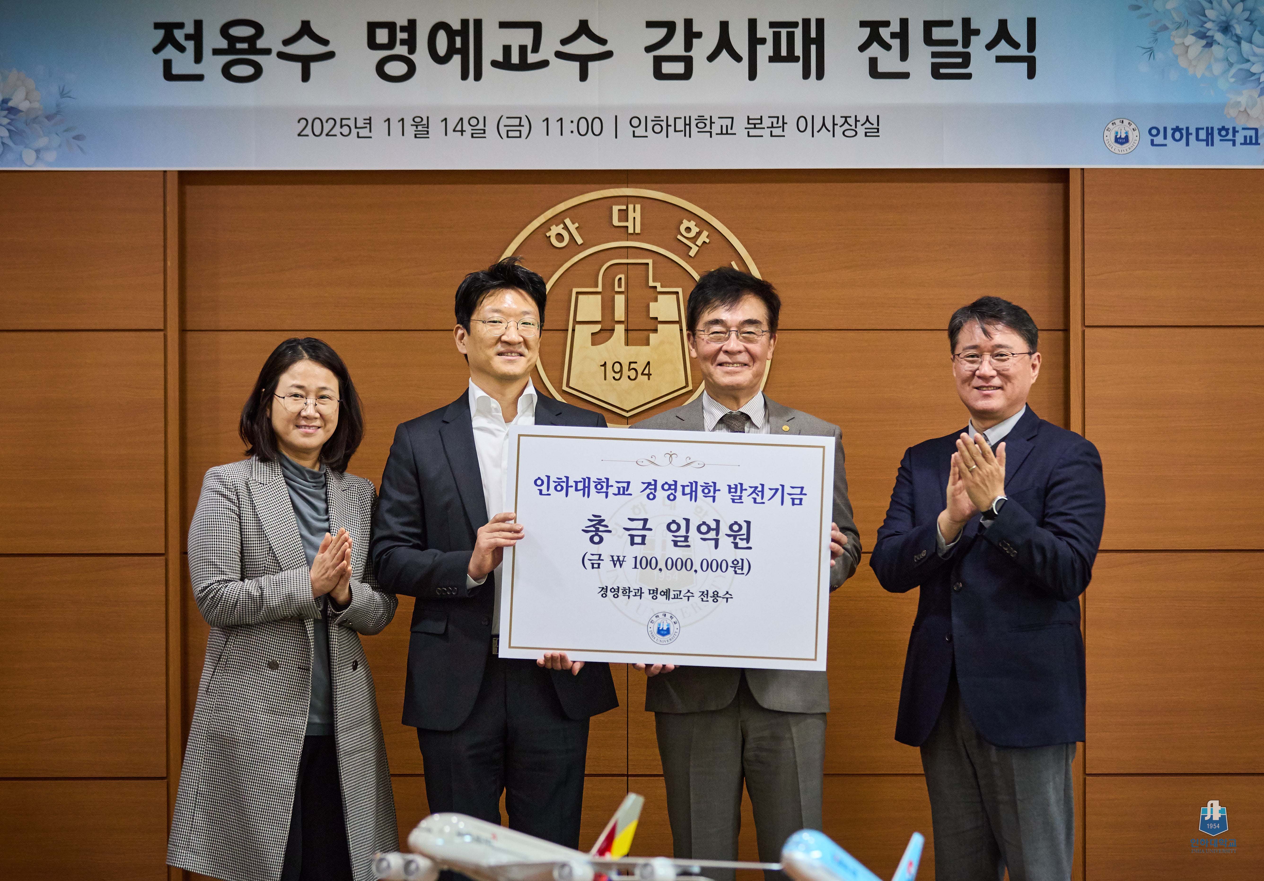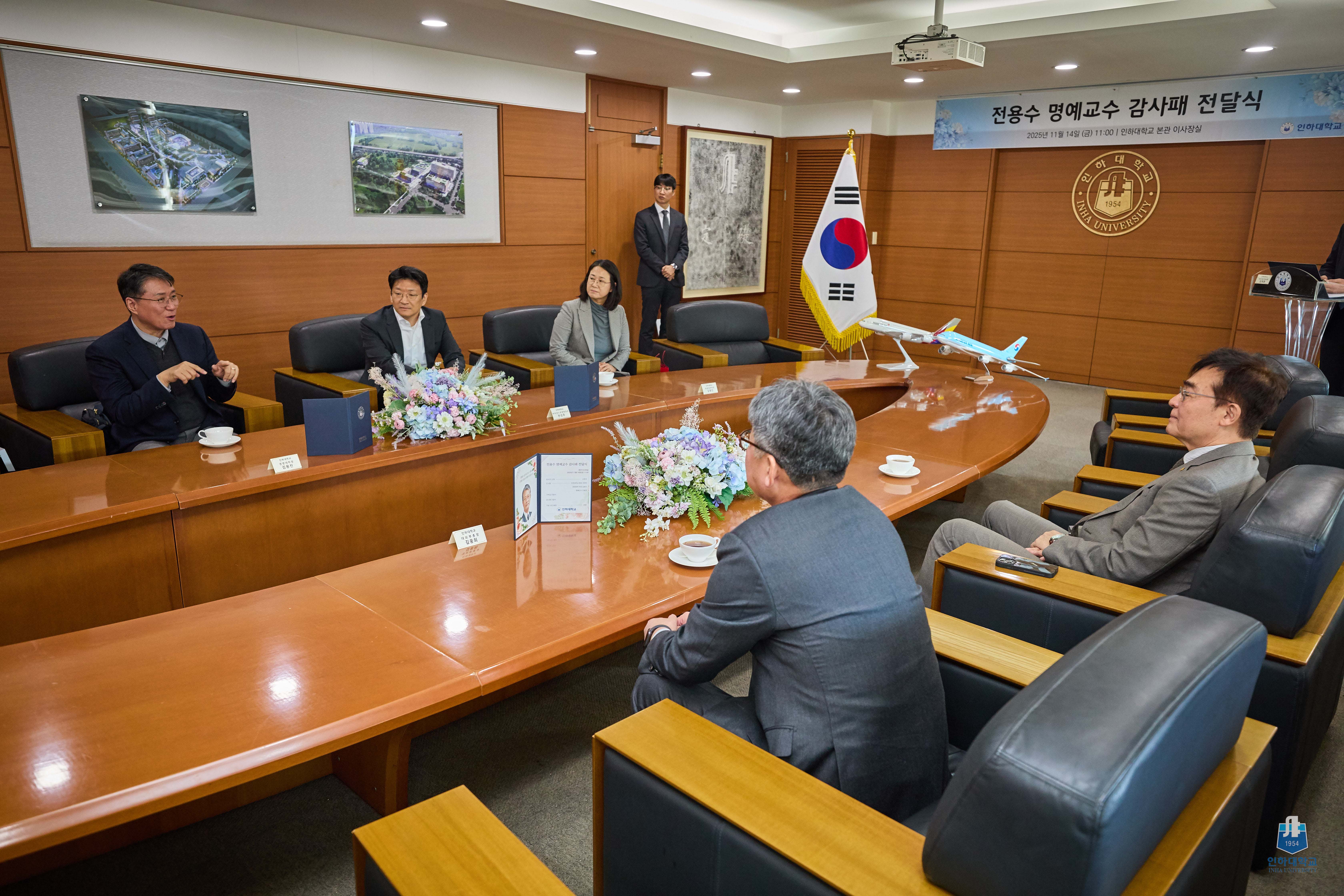 ▲14일 본관 이사장실에서 전용진 명예교수 감사패 전달식 참석자들이 기념사진을 촬영하고 있다.