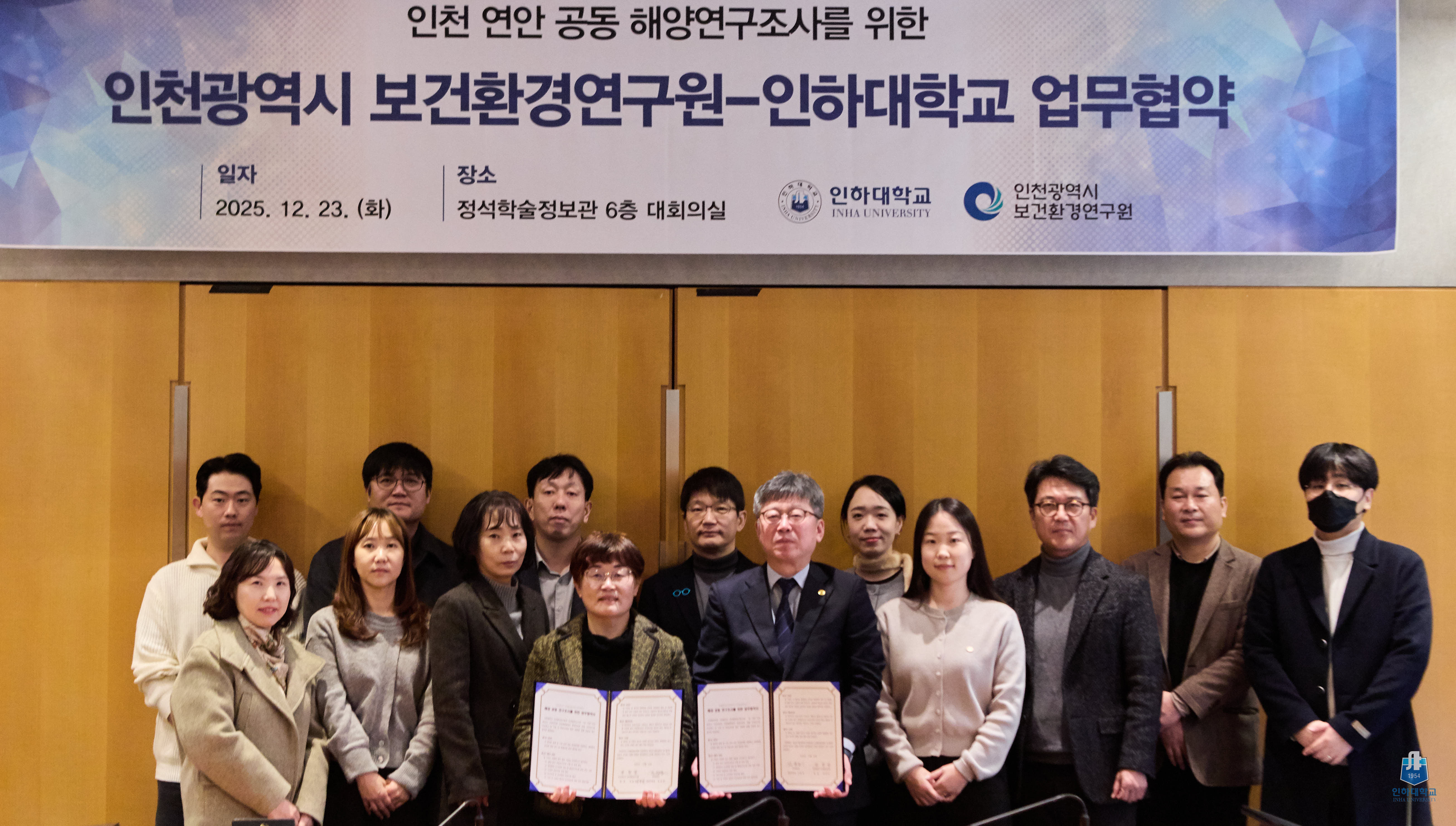 ▲ 본교와 인천시 보건환경연구원이 진행한 인천해역 해양환경 공동조사·연구협력 관계 구축을 위한 업무협약식에서 참석자들이 기념카지노사이트을 촬영하고 있다.