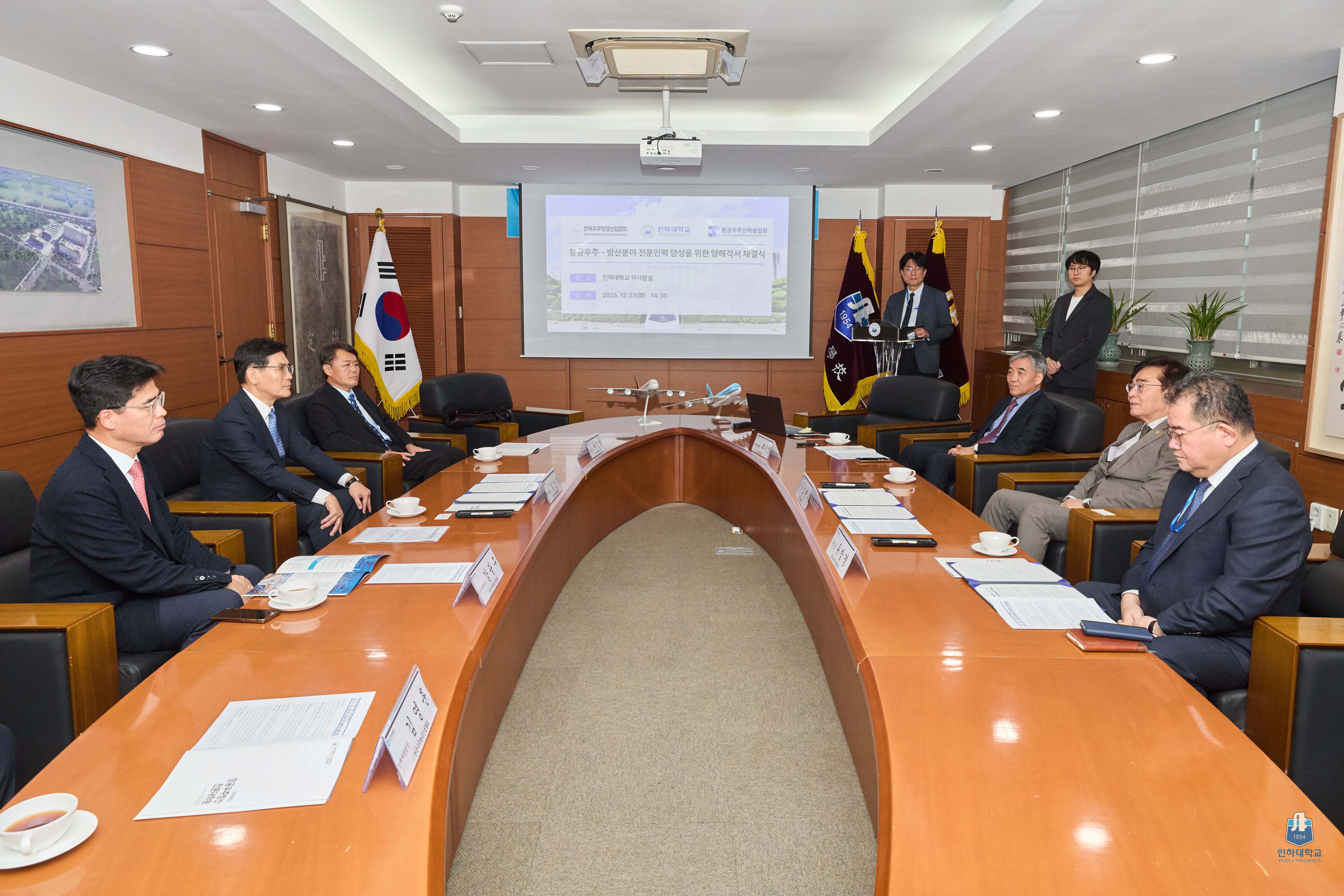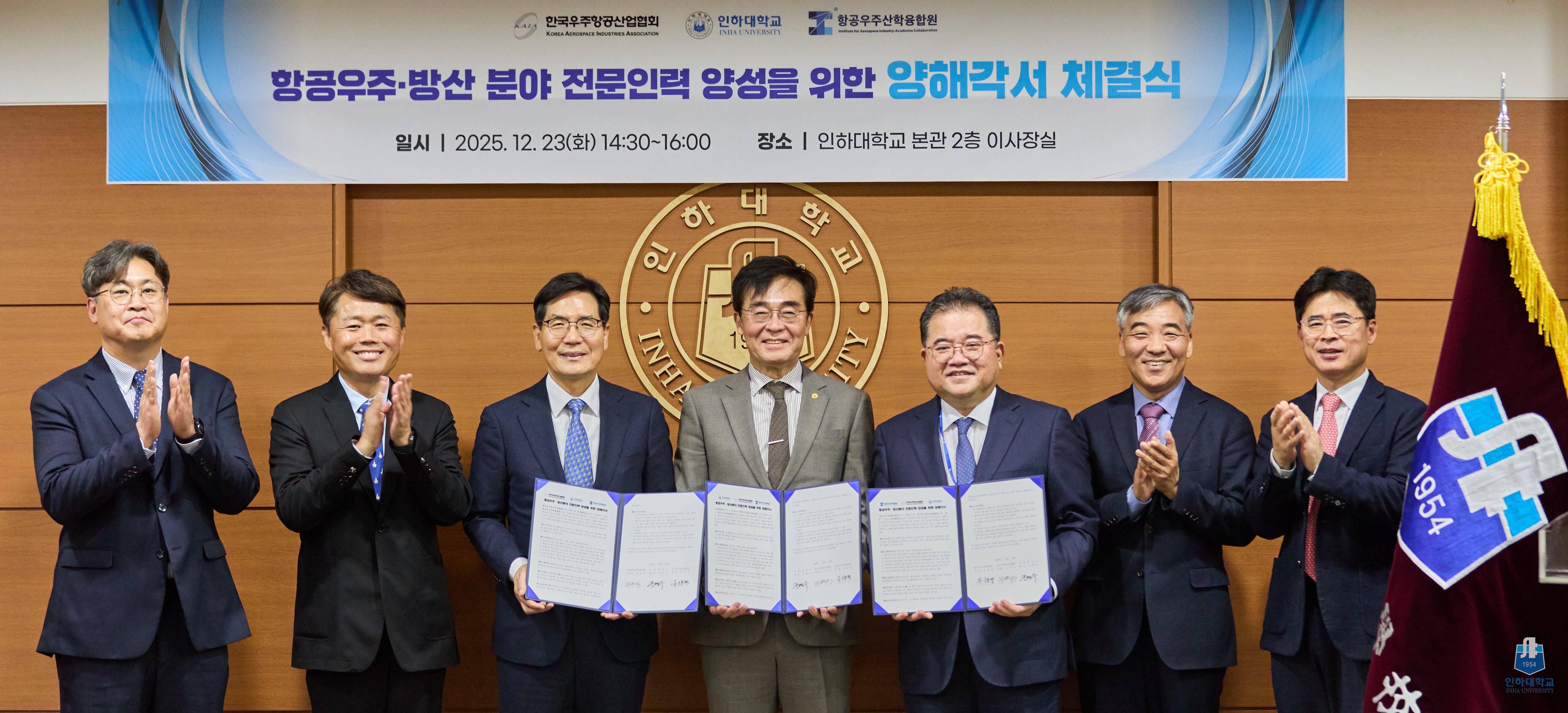 ▲ 23일 본관에서 열린 항공우주·방산 분야의 핵심 전문인력 양성 업무협약에서 인하대, 한국우주항공산업협회, 항공우주산학융합원의 관계자들이 기념카지노사이트을 촬영하고 있다.