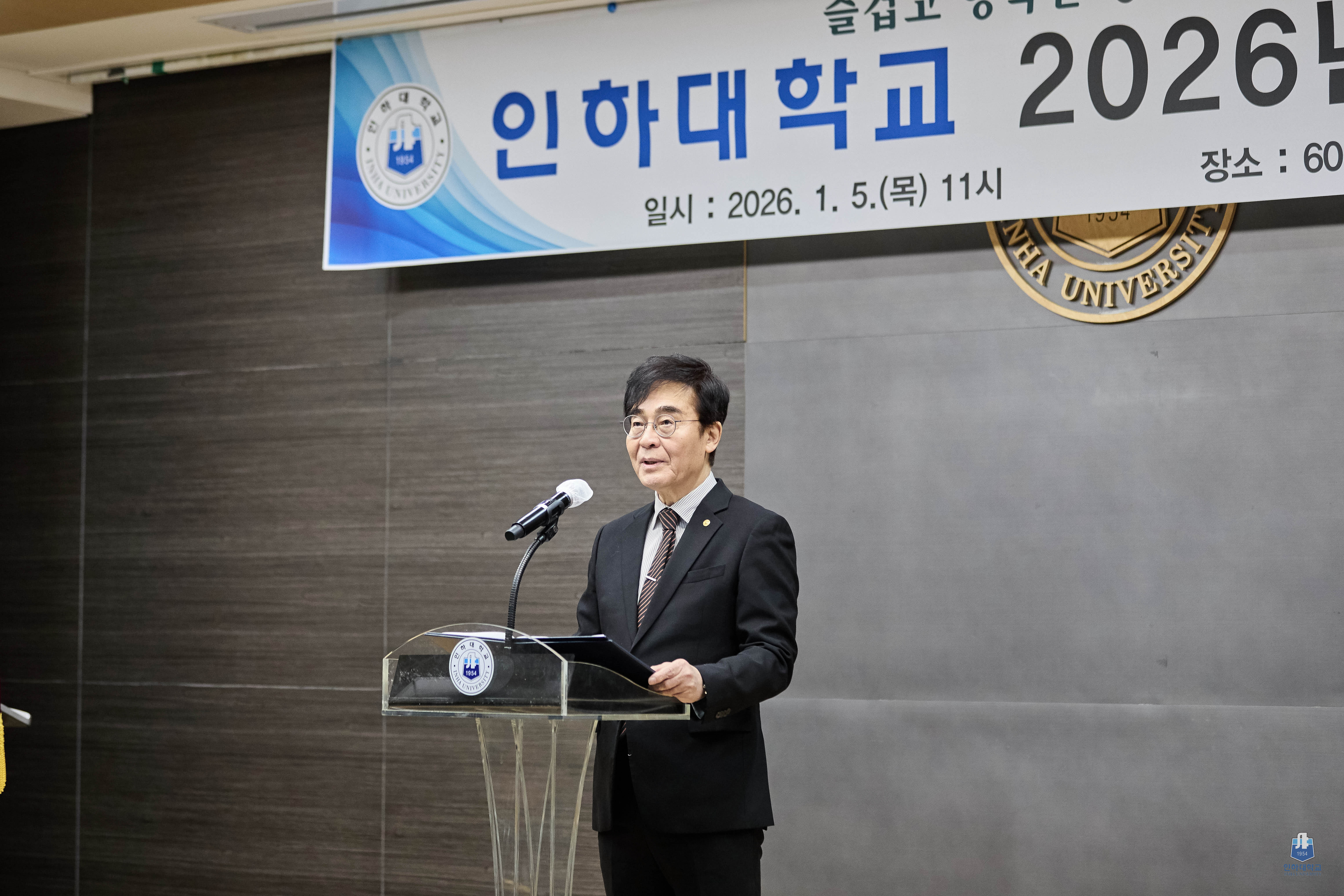 ▲ 60주년기념관 월천홀에서 열린 신년하례식에서 조명우 총장이 2026년 신년사를 하고 있다.